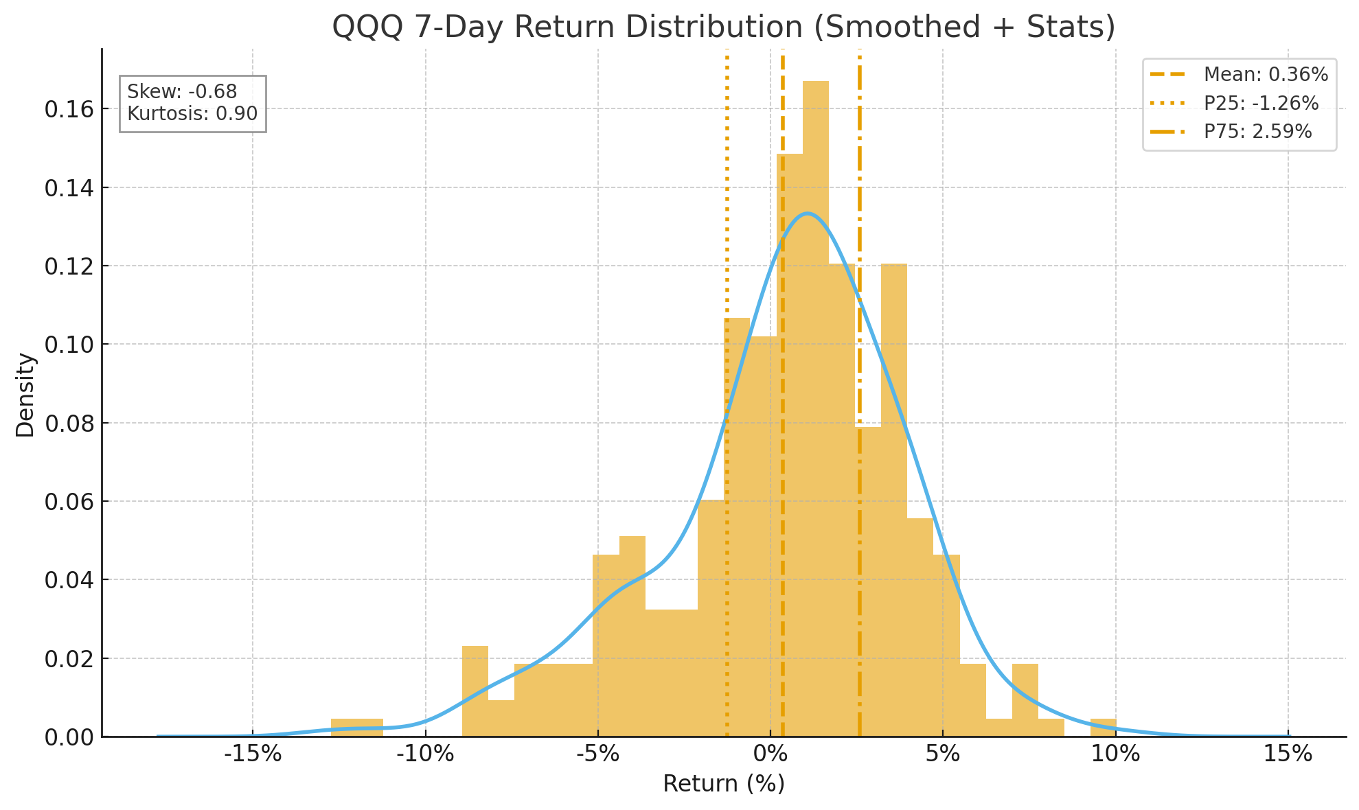 To better understand this risk-reward profile, we use a Monte Carlo framework. In simple terms, this involves fitting a probability distribution to past returns observed in similar environments and then simulating many possible paths forward. The current simulations show a tilt toward positive outcomes, but they also emphasize that losses of a few percent over the next week or two are still very much on the table. This is not the kind of setup that calls for extreme caution, nor is it one that justifies maximum aggression.